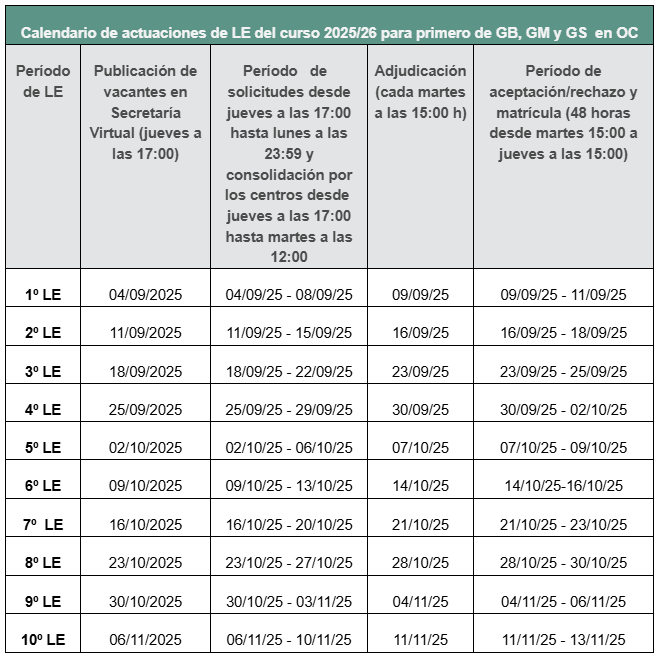 Nuestro centro tiene como plazo máximo de matriculación hasta el día 30 de octubre de 2025, por lo tanto, la última lista de vacantes será la del 23/10/2025.