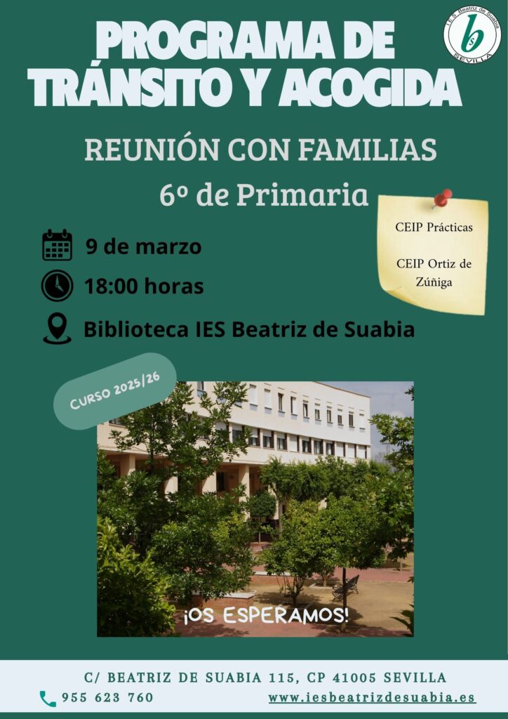Desde nuestro centro educativo, damos la bienvenida a las familias del nuevo alumnado de 1º de ESO y 1º de Bachillerato del próximo curso. Os invitamos a participar en las reuniones informativas del Programa de Tránsito y Acogida.