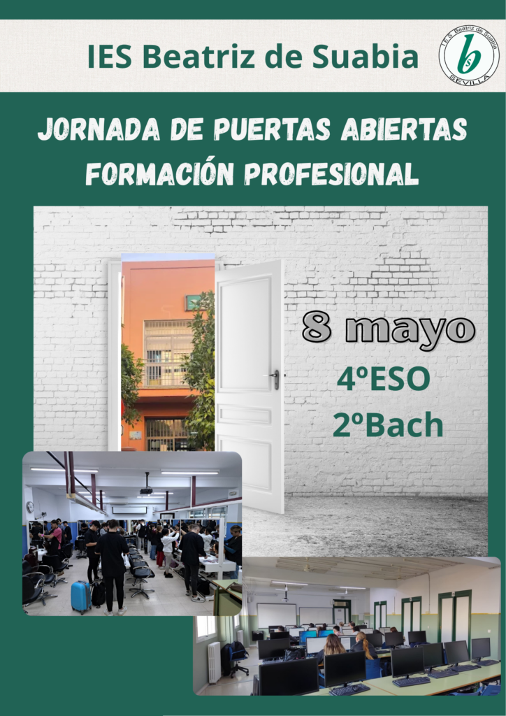 El próximo 8 de mayo celebraremos en nuestro instituto una Jornada de Puertas Abiertas de Formación Profesional, dirigida al alumnado de 4ºESO y 2ºBachillerato, con el objetivo de dar a conocer la oferta formativa de FP de nuestro centro.