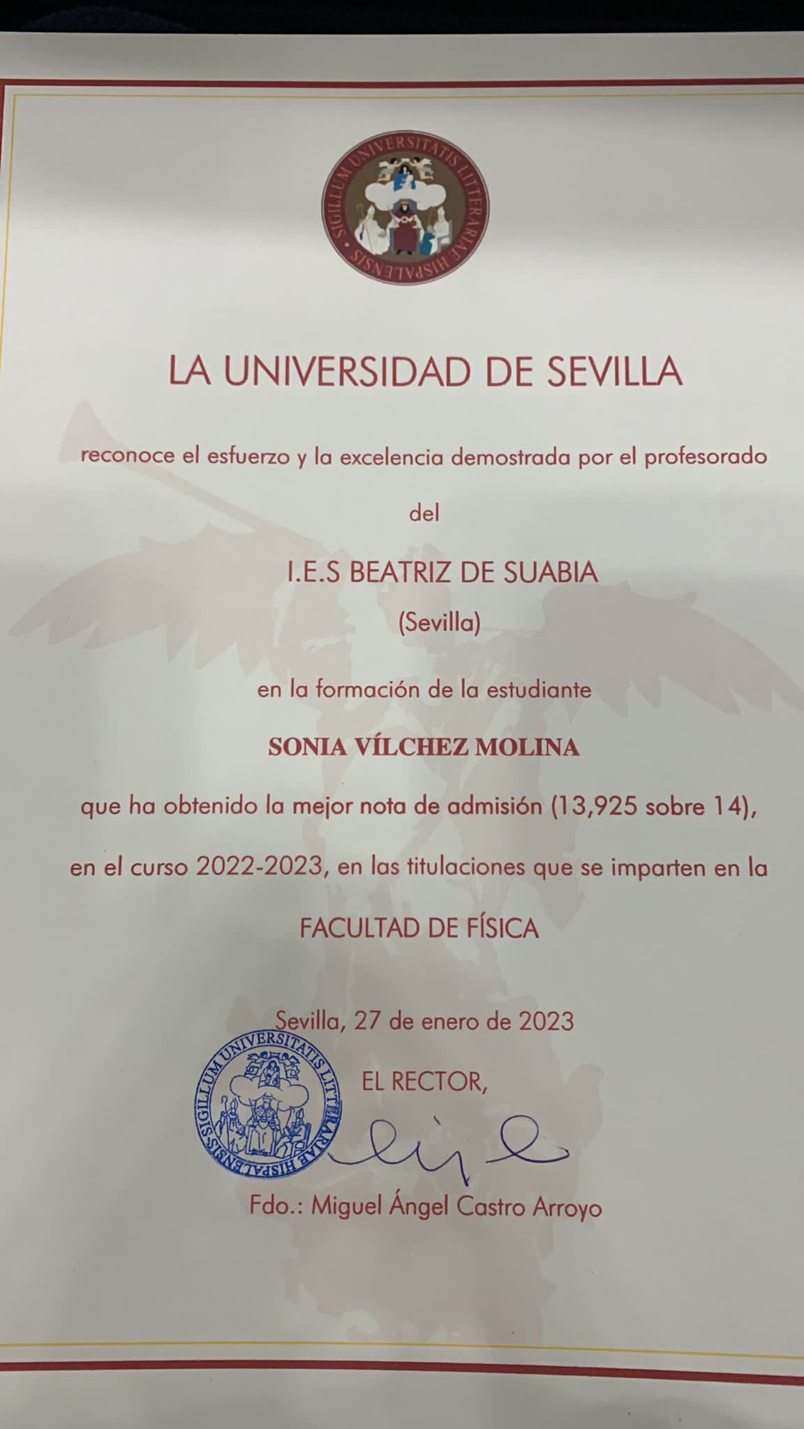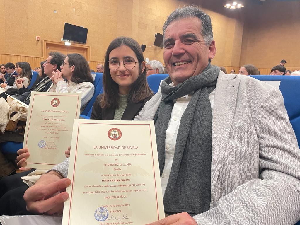 Enhorabuena al profesorado de nuestro centro por su labor en la formación de Sonia Vílchez Molina, que obtuvo la mejor nota de admisión en las titulaciones que se imparten la facultad de Física de la Universidad de Sevilla.